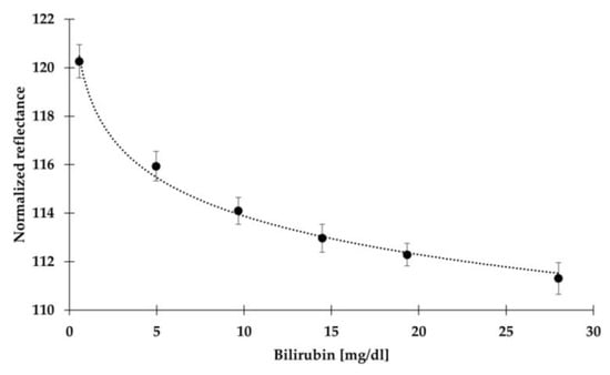 The exponential law used to approximate the relationship between bilirubin and normalized reflectance (dimensionless number). Black dots represent the averaged values for each bilirubin concentration (0.56 to 28.00 mg/dL). Error bars represent the standard deviation for each level. The normalized reflectance values exceed 100 due to the normalization procedure; blank reflectance is measured using the compensation wavelength of 590 nm, which due to the current supply of the LED, has a lower luminous intensity compared to the measurement wavelength of 465 nm. Consequently, for all tested bilirubin levels, the blank reflectance values used for normalization are lower than the actual reflectance values recorded during the measurement at 465 nm, resulting in values above 100.
