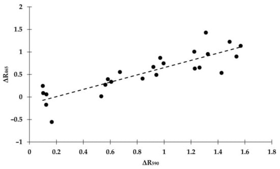 A significative correlation was found between ΔR465 and ΔR590, and a linear model adequately approximated the relationship with acceptable accuracy (R2 = 0.74, p < 0.05) (Figure 3).