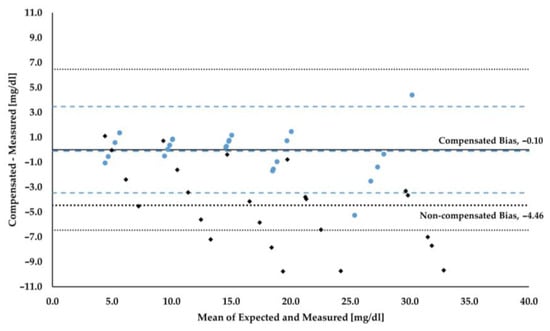 Bland–Altman plot showing both non-compensated and compensated results. Black diamonds represent non-compensated results; blue circles represent compensated results; thin dotted black lines represent upper and lower limits of agreement for non-compensated results (6.46 and −6.46 mg/dL, respectively); thin dashed blue lines represent upper and lower limits of agreement for compensated results (3.46 and −3.46 mg/dL, respectively); thick dotted black line represents bias for non-compensated data (−4.46 mg/dL); thick dashed blue line represents bias for compensated data (−0.10 mg/dL).