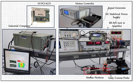 A signal generator produces a sinusoidal signal with an excitation frequency of 1 MHz and an amplitude of 1 Vpp, which is loaded into the excitation coil. The detection coil senses the secondary magnetic field generated by the induced eddy currents in the CFRP. The resultant sinusoidal detection voltage signal is then transmitted to the lock-in amplifier to extract the real and imaginary components of the detection voltage signal. The data acquisition card collects this output voltage information and sends it to the industrial computer for data processing, image display, and storage.