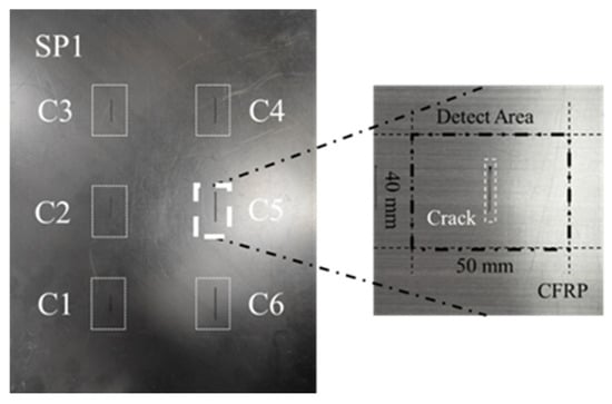 Figure 2 illustrates Specimen 1, a defective CFRP specimen containing cracks of varying sizes but identical orientations. The specific dimensional parameters are provided in Table 1.