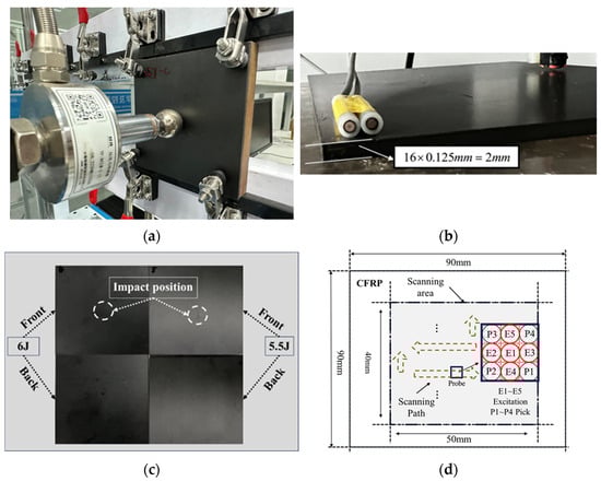 Drop hammer impact test equipment and impact damage detection schematic diagram, the detection trajectory of the probe is represented by the dashed arrow. (a) Impact equipment; (b) schematic diagram of plywood thickness direction; (c) CFRP defective specimens under two impact energies; (d) schematic diagram of eddy current detection.