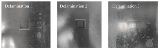 To simulate the common form of delamination damage in CFRP, insulating shims were embedded between the layers. Materials such as PTFE and release paper were inserted at specific positions and depths during the fabrication of the CFRP specimens, as shown in Figure 5.