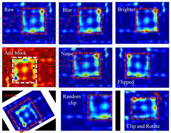 For the CFRP specimens with the three aforementioned defects, a high-precision, high-sensitivity, nine-grid eddy current probe was employed for detection. The detection results of the CFRP eddy current inspection system for these defects were captured and analyzed. Meanwhile, the number of training samples is critical for the neural network training process. A robust training set, rich in sample variety, enhances the generalization ability and robustness of deep network models. Deep neural networks can learn essential features and descriptive patterns from a diverse set of training samples, rather than merely memorizing data details. Data containing the same high-level semantic information but differing in appearance should be recognizable by the deep network. Thus, simple deformation operations on raw images containing high-level semantic information can be beneficial for network training. Such simple transformation operations include random cropping, random flipping, random scaling, luminance transformation, and random color transformation, as illustrated in Figure 6.