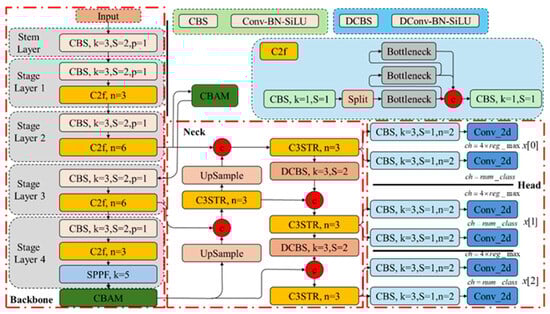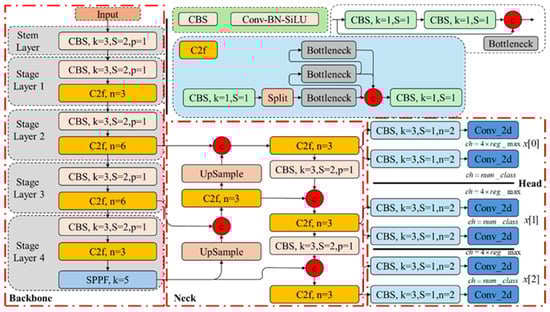 The YOLO model network consists of three main components: the backbone, neck, and head. The backbone handles feature extraction, and its ability to extract advanced semantic features is improved while reducing the model parameters through the C2f sub-module. The Convolution–Normalization–Activation (CBS) module increases the number of feature maps and reduces their resolution, creating a “pyramid” structure in the backbone network. The Spatial Pyramid Pooling Fast (SPPF) module concatenates the pooling results of various scales, enhancing the spatial multi-resolution capabilities of the YOLO model.