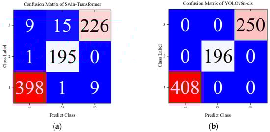 Confusion matrices of Swin-Transformer and YOLOv8. (a) Swin-Transformer; (b) YOLOv8n-cls.