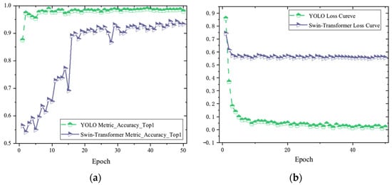 The experiment provides additional data related to the training process of the YOLOv8 model, as shown in Figure 10. Using the YOLOv8n-cls model, the accuracy has been maintained above 99% after the first five epochs, while the Swin-Transformer model’s classification accuracy rises to 90% after 20 epochs and stabilizes within the range of 94% to 95% after about 50 epochs.