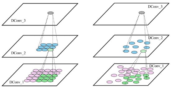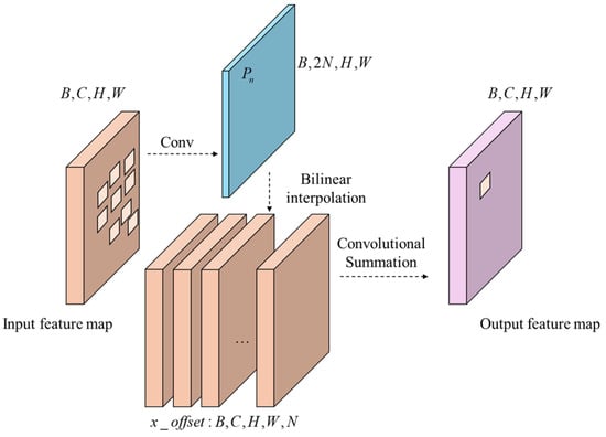DConv runs as shown in Figure 12. The neural network is trained to characterize the position by parameter , which allows the model to learn the deformation information of the target. Its dimension is , , and is the size of the convolutional kernel.
