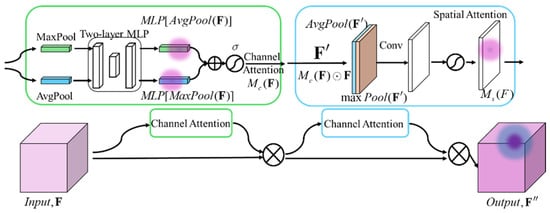 The CBAM consists of a channel attention module and a spatial attention module wired in series, as shown in the following Figure 13.