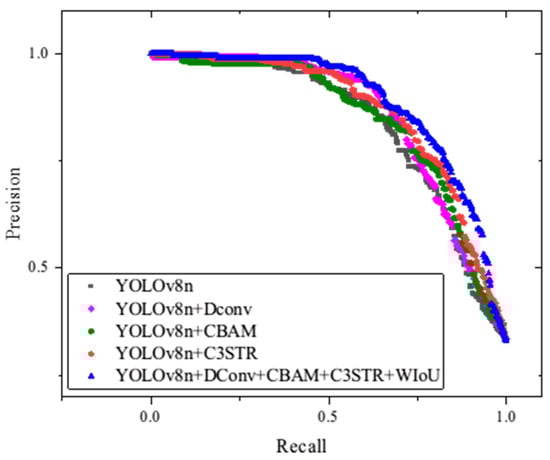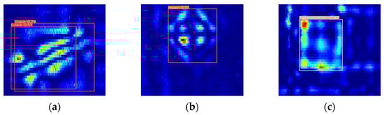 The accuracy of EDC-YOLO is 89.1%, which is slightly lower than the 90.2% achieved with the WIoU module and the 89.3% with C3STR, but higher than the accuracy with the DConv and CBAM modules. This discrepancy may be attributed to the large-scale nature of CFRP defects. The C3STR module, with its global self-attention mechanism, is particularly effective in identifying large-scale CFRP damage. In contrast, the DConv and CBAM modules, which are more sensitive to small- and medium-sized targets, are less effective in accurately identifying and localizing CFRP defects on a larger scale.
