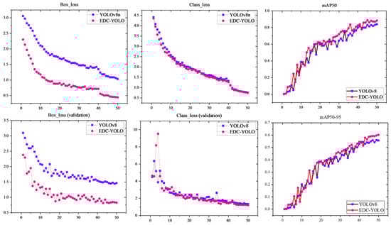 According to the graph, EDC-YOLO achieves an mAP50 of 88.3%, marking a 4.4% improvement over YOLOv8n’s 83.9%. While the addition of a single module offers marginal gains, the integration of multiple modules significantly enhances the YOLOv8n model’s detection performance. Figure 18 further illustrates the training data curves for the first 50 epochs of both the YOLOv8n and EDC-YOLO models.