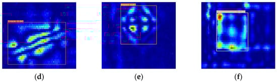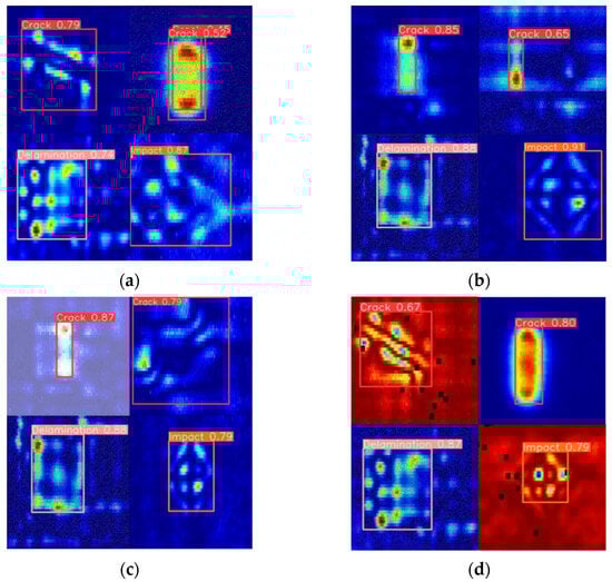 Considering the occurrence of multiple defects during the eddy current detection of CFRP in a single procedure, it is essential to evaluate the model’s effectiveness for multi-defect target detection. To this end, this study combined different types of CFRP defect images—two cracks, one impact damage, and one delamination damage—into a single image and input this into the EDC-YOLO model to simulate the multi-target detection process. The results of this detection process are shown in Figure 20.