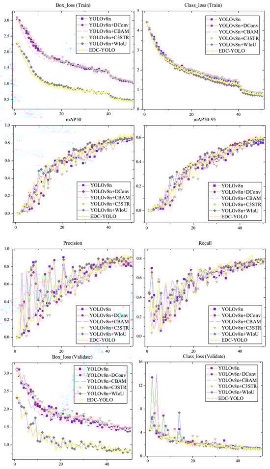 To further assess the impact of the four modules—DConv, CBAM, C3STR, and WIoU—in enhancing the performance of YOLOv8n, an ablation study was conducted. This study provides metric curves for the first 50 training epochs across different scenarios, as illustrated Figure 22.