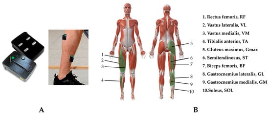 A wireless EMG system (Delsys Trigno Wireless System, DELSYS, Boston, MA, USA) (Figure 2A) was used to obtain surface EMG signals of 10 muscles in the dominant lower limb at 2000 Hz. Sensors were installed only on the dominant side of the subjects, and data collection was limited to this side. Dominant lower limb refers to the leg that exhibits higher functionality and coordination during activities, typically the leg that is used more frequently in standing, walking, or performing movements. The EMG system consists of wireless Ag electrodes arranged in parallel bar (contact area: 1 × 10 mm; distance between electrodes: 10 mm). Subjects underwent skin preparation, including shaving and cleaning with alcohol. Electrodes were then placed over the muscle belly aligned with the muscle fiber orientation according to SENIAM recommendations [29], attached to the skin with double-coated tape, and fixed with athletic tape. The muscles recorded included the gluteus maximus (Gmax), semitendinosus (ST), biceps femoris (BF), vastus medialis (VM), rectus femoris (RF), vastus lateralis (VL), gastrocnemius medialis (GM), gastrocnemius lateralis (GL), soleus (SOL), and tibialis anterior (TA) (Figure 2B). One retroreflective marker (14 mm) was placed on each end of the lateral center of the pedals to measure the crank angle. The markers’ trajectory was measured at 200 Hz by a Vicon motion capture system (Vicon Motion Analysis, Oxford, UK). The Vicon system and Delsys system were synchronized. In each trial, the data were recorded for 30 s once the steady cadence was reached.
