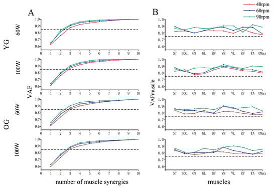 In Figure 3A, we can find that when the number of synergies is three, the VAF values for all riding conditions were above the horizontal line of 0.85 for both populations, and three synergies led to VAFmuscle ranging from 0.771 ± 0.034 (GM during the 40 rpm at 100 W on OG) to 0.923 ± 0.046 (VM during the 90 rpm at 100 W on YG) (Figure 3B). Therefore, we extracted three synergies for young and older adults.