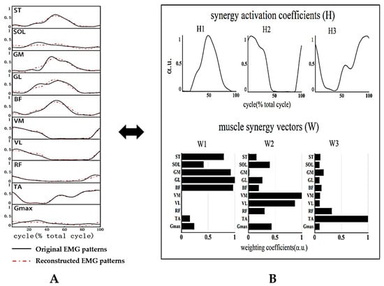 An example of muscle synergy extraction. (A) Original and reconstructed EMG curves. (B) Extracted muscle synergies. ST: semitendinosus; SOL: soleus; GM: gastrocnemius medialis; GL: gastrocnemius lateralis; BF: biceps femoris; VM: vastus medialis; VL: vastus lateralis; RF: rectus femoris; TA: tibialis anterior; Gmax: gluteus maximus; W1, W2, and W3 represent synergy vectors one, two, and three, respectively; H1, H2, and H3 represent activation coefficients one, two, and three, respectively.