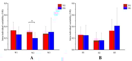 Intra-individual variability (VR value) of W (A) and H (B) for the young and older groups. W1, W2, and W3 represent synergy vectors one, two, and three, respectively; H1, H2, and H3 represent activation coefficients one, two, and three, respectively; YG: young group; OG: older group; W: muscle synergy vectors; H: synergy activation coefficients. * indicates a significant difference.