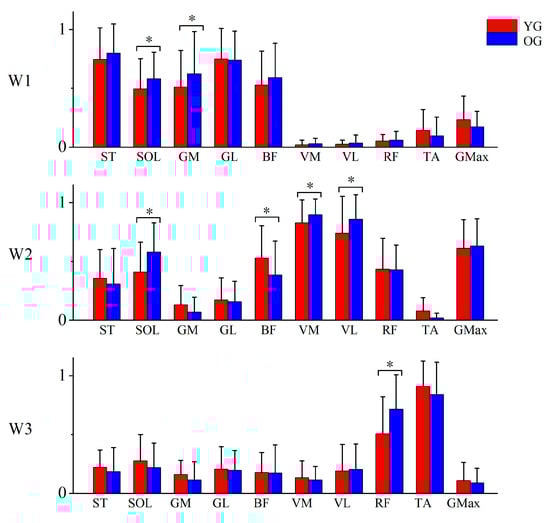 Comparison of W in the young and older groups; W1, W2, and W3 represent synergy vectors one, two, and three, respectively; YG: young group; OG: older group; ST: semitendinosus; SOL: soleus; GM: gastrocnemius medialis; GL: gastrocnemius lateralis; BF: biceps femoris; VM: vastus medialis; VL: vastus lateralis; RF: rectus femoris; TA: tibialis anterior; Gmax: gluteus maximus. * indicates a significant difference.