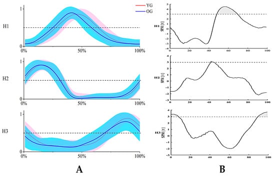 (A) Comparison of H in the young and older groups. (B) Statistical differences in H calculated using spm1d; the gray shaded area represents p < 0.05, a = 0.05. H1, H2, and H3 represent activation coefficients one, two, and three, respectively; YG: young group; OG: older group.
