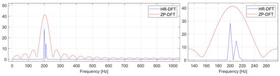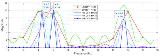 Here, we want to provide the reader with an example not given in [] and show how the spectrum evolves when the high-resolution transform length is successively increased. In the example shown in Figure 4, 10 samples of the sum of 3 complex exponentials are transformed using a standard DFT (LR-DFT) of length 10, a zero-padded DFT of length 40, and a high-resolution DFT (HR-DFT) of different lengths: 20, 30, and 40, respectively. As expected, for , when the resolution is 0.5 Hz, the given exponents are found perfectly (without leakage); and in contrast to the case of LR-DFT, where the resolution is 2 Hz, here, the frequencies  and  are resolved.