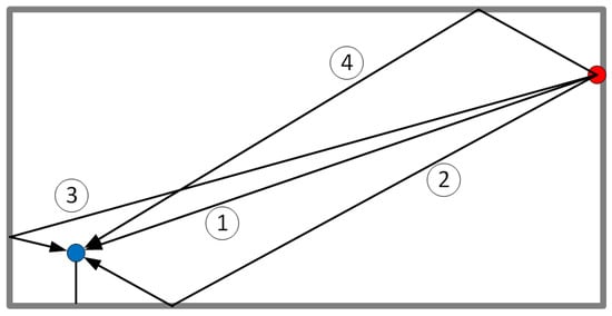 A real 1D stage (linear floor along the bottom line) with width = 20 m and height = 10 m. The red transceiver transmits signals to the blue transceiver. The real path lengths are  m (LOS),  m,  m, and  m.