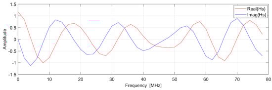 One of the relatively new applications of locating objects/people is in virtual acoustics. In this application, we want to know the position of people on a stage so that we can correctly place acoustic objects corresponding to real objects in the virtual acoustic scene. Let us imagine a linear (1D) stage with a width of 20 m and a height of 10 m (for simplicity, we assume that the stage’s depth is 0 m, i.e., we consider a 1D stage) as shown in Figure 5. On this stage, we place an object (an actor) with a transceiver attached (the blue ball). The second transceiver (the red ball) is installed on the right wall. In the BLE standard, the red transceiver usually acts as the Initiator, which sends signals to the blue transceiver (the Reflector), which then sends the received signals back to the Initiator. However, for simplicity, we assume that the transceivers are synchronized, meaning that we can measure the phase of the signal sent from one of those transceivers to the other without sending the received signal back to the transmitter. We assume the radio system is similar to the one in the BLE standard, i.e., we have 40 channels, each 2 MHz wide, in the 2400–2480 MHz band. We consider the LOS path and only one reflection per surface, i.e., three reflections. In Figure 6, we show an example of complex exponentials (Hs) that have been generated using the phase data achieved by simulating the case shown in Figure 5.