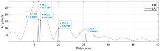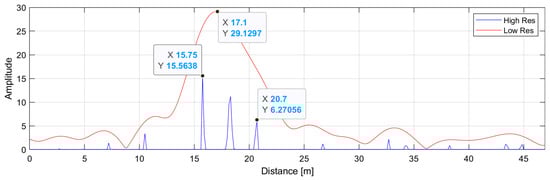 Amplitude spectrum of a phase-signal similar to that from Figure 6: (RED) Low-resolution zero-padded IDFT. (BLUE) High-resolution IDFT. The ground truth distances are  m,  m,  m, and  m, respectively. SNR = 20 dB.