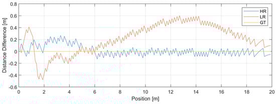 As you can see, the error for the LR transform is up to 0.5 m, while the error for the HR transform—in most cases—does not exceed 0.2 m. The mean value and the standard deviation for HR transform are  m and  m, while for LR transform, it is  m and  m, respectively.