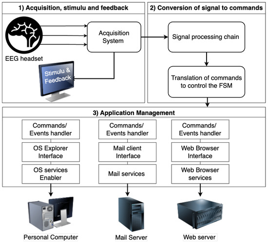 The proposed framework is designed to assist people with severe motor disabilities in communicating via email, browsing the internet, and interacting with their computer’s operating system using their thoughts rather than muscle movements. Figure 1 presents the general overview of the proposed framework, which integrates signal processing algorithms, allowing the detection of the motor imagery signal and the P300 evoked potential to write text, navigate web pages, and develop a command-line interface to manage the Operating System (OS) Explorer.