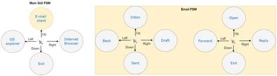 The subject can use four thoughts, to be mapped into limited control commands, to manage the whole application through a predefined FSM. Figure 2 presents the proposed FSM, where each user’s choice from an application menu corresponds to a state transition of the FSM. Each imagined limb movement will generate a brain activity signal utilized as input to the FSM to generate a transition from one state to another, along with a possible output. Users can use their left hand, right hand, both hands, or rest to interact with the main features of the integrated system. If the user thinks about moving their right hand, the Internet Browser application will be launched. Likewise, if he imagines moving his left hand, the OS explorer will be activated. When the main Graphical User Interface (GUI)-FSM is activated and the user thinks about moving both hands, an email API will launch, allowing the user to control their email account. The application will display the user’s email account folders. The inbox folder will be accessible after the user thinks about moving both hands. The same procedure will be applied to open, reply, forward, and delete emails.
