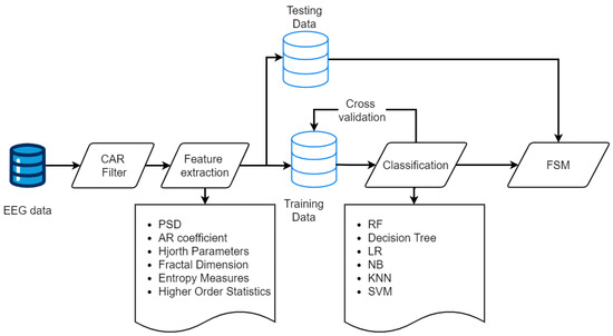 In the classification stage, we evaluated multiple machine learning models with our dataset. We split the data into training and testing sets to ensure robust model evaluation. The training set, comprising 80% of the data, was used to fit the models, while the remaining 20% was reserved for evaluating their performance. This allowed us to assess how well each model generalized to unseen data. The classifiers tested included Random Forest (RF), K-Nearest Neighbors (KNN), SVM, Naive Bayes (NB), Logistic Regression (LR), and Decision Tree (DT), chosen for their distinct advantages in handling EEG signal classification complexities.
