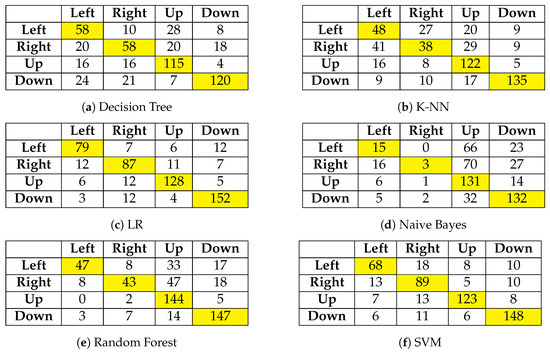 In the realm of classifying four-class motor imagery, LR demonstrated the highest accuracy. However, SVM and RF models also proved to be strong contenders, exhibiting high precision and recall with fewer misclassifications. In contrast, the DT, KNN, and NB models encountered more challenges, particularly in distinguishing between Class 1 (RIGHT) and Class 2 (LEFT), as shown in Figure 4. While LR emerged as the top choice for accuracy, SVM and RF are also excellent options due to their strong performance across all metrics.