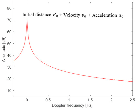 Although the rigid-body Doppler is removed using (35), the spectrum can be blurred by the effect of the acceleration of the rigid body. In addition, because the FT of the acceleration component yields a Doppler bandwidth with an irregular passband (Figure 1), the estimation of v0 may not be accurate. Consequently, Equation (35) may yield an estimation error, resulting in a shift in the frequency components of .