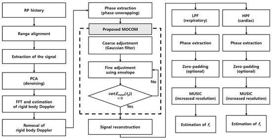 This subsection introduces an efficient method for estimating the vital parameters and with super-resolution by compensating for motion and applying the MUSIC algorithm (Figure 4).