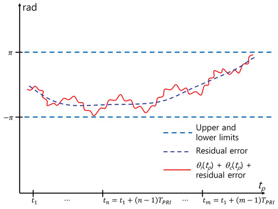 First, because in (7) is heavily dependent on and , the scatterer migrates into neighboring range bins. Consequently, cannot be formed by clipping at a fixed range . Therefore, the RPs should be aligned such that the scatterer is located in the same range bin for all . While exact estimation of motion parameters and is impossible without errors, we used a widely adopted non-parametric method. Among various methods, we employed entropy minimization, which is commonly used in inverse synthetic aperture radar imaging [30].