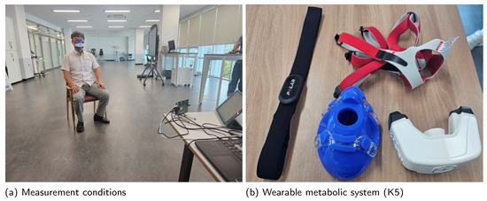 Measurements were conducted using both the X4M03 and Distance2GoL radars. The subject was positioned approximately 2 m away from the radar sensor. Using the same frame time and frame step as in the experiment, the s and s of the received signal were estimated. To evaluate the accuracy of these estimations, actual s and s were measured using a wearable metabolic system, the K5 produced by COSMED, and compared with the estimated values (see Figure 9).