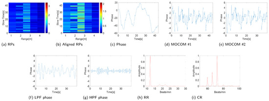 The experimental results confirm the efficiency of the proposed method (Figure 10 and Figure 11). Entropy minimization successfully aligned the RPs of the IR-UWB and FMCW radars (Figure 10b and Figure 11b). However, the phase of the signal post-PCA was considerably distorted owing to motion, obscuring the sinusoidal patterns of the RR and CR (Figure 10c and Figure 11c).