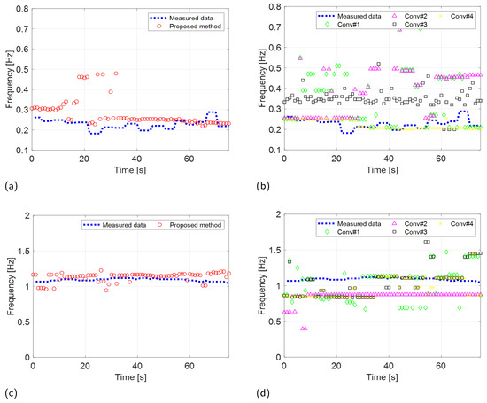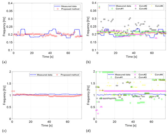 Experimental results (FMCW: Distance2GoL) comparing the VSE performance of the proposed and conventional methods. RR estimation of the (a) proposed and (b) conventional methods. CR estimation of the (c) proposed and (d) conventional methods.