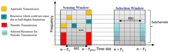 After every transmission, the value of the is decremented by one, and when = 0, the ego vehicle selects new subchannels with probability 1 − P, where P is the keep probability; P ∈ [0, 0.8]. On the other hand, vehicles using the DS scheme select new subchannels every time a new message is generated, and they are not allowed to place any reservations. In other words, DS is the reservation-less variant of the SB-SPS scheme, which sets = 1 and P = 0. Despite being characterized by a totally different reservation policy, the SB-SPS and DS schemes employ the same resource reselection process (illustrated in Figure 1). The ego vehicle’s subchannel selection process involves two main phases: the sensing window and the selection window, as shown in Figure 1. During the sensing window, which spans from to depending on the subcarrier spacing (SCS), the ego vehicle identifies and excludes subchannels reserved by neighboring vehicles if the reservation signal exceeds a certain Reference Signal Received Power (RSRP) threshold. Additionally, subchannels previously used by the ego vehicle during this period are excluded due to half-duplex limitations.