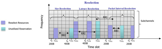 SB-SPS operates by allowing vehicles to periodically reserve subchannels for a fixed number of transmissions, defined by the reselection counter and the resource reservation interval (RRI). Vehicles using the SB-SPS scheme periodically reserve the selected subchannel(s) for a number of consecutive transmissions. The time between consecutive reservations is called the resource reservation interval (RRI), and 5G-NR-V2X Mode 2 supports any RRI value in the {0, [1:1:99], [100:100:1000]} ms range, where in the [x:y:z] notation, x denotes the minimum allowed value; z, the maximum; and y, the incremental step between consecutive values. Vehicles employ the SCI to broadcast the adopted RRI configuration and to inform neighboring vehicles about their next reservation. Depending on the selected RRI, the value of the is set as follows: if RRI ≥ 100 ms, is randomly set between the [5, 15] interval [1,5].