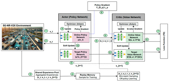 The SEAC model efficiently allocates communication resources among vehicles by employing both actor and critic networks. The actor network is responsible for selecting actions based on the current state provided by the 5G-NR-V2X Mode 2 environment. The actor network generates an action using its online policy network , which is subsequently executed in the environment. This action influences the environment, leading to a new state and a corresponding reward [21,22].