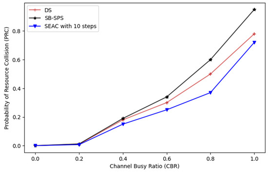 At the beginning, all the techniques show a similar PRC at low channel busy ratios (CBRs), indicating comparable effectiveness in low-traffic scenarios. However, as the CBR increases, traditional methods like SB-SPS and DS quickly experience a sharp rise in the PRC, leading to higher collision rates. In contrast, the SEAC, particularly in the 10-step simulation, maintains a lower PRC even at higher CBR levels. The SEAC model with 10 steps refers to the reinforcement learning model using a 10-step lookahead strategy. This approach allows the model to make more informed decisions by considering the potential outcomes of actions over the next 10 time steps, optimizing the resource allocation and collision avoidance.