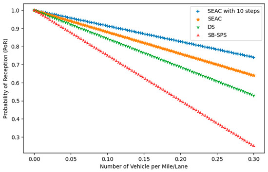 As the vehicular density increases, all methods show a decline in the PRR. However, SEAC, particularly with the 10-step configuration, consistently achieves a higher PRR compared with DS and SB-SPS. SEAC’s superior performance is evident from its ability to maintain near-perfect reception at low densities and a slower decline in the PRR as the density increases. In contrast, DS and SB-SPS experience more significant reductions in the PRR, indicating less effective resource management.
