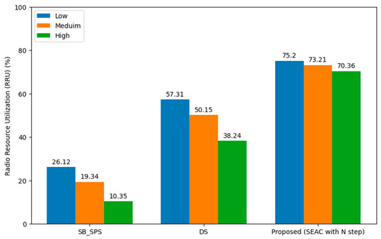 The SEAC method shows consistently higher RRU, with utilization rates of 75.2%, 70.21%, and 64.36% for low, medium, and high vehicular densities, respectively. This indicates superior efficiency in resource management compared with DS and SB-SPS, which exhibit a noticeable decline in RRU as the vehicular density increases. The SEAC’s use of GRUs for predictive modeling allows for real-time adjustments in resource allocation, effectively optimizing bandwidth usage and managing the variability in data traffic demands. This ensures reliable and efficient communication in V2X networks, particularly in dynamic and complex scenarios.