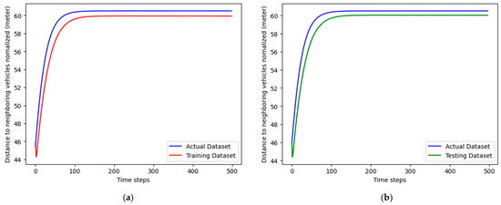 The two provided graphs illustrate the model’s predictions for the distance to neighboring vehicles, which are normalized and compared across actual, training, and testing datasets. The x-axis represents time steps, while the y-axis denotes the distance in meters. In Figure 8a,b, both graphs present the normalized distance to neighboring vehicles in meters over 500 time steps for three datasets: actual, training, and testing. The blue line represents the actual dataset, which shows a rapid increase in distance that stabilizes at around 60 m after approximately 100 time steps. The red line, indicating the training dataset, closely follows the actual dataset, signifying that the model has been trained effectively and captures the underlying trend accurately. Similarly, the green line for the testing dataset closely follows the actual dataset, demonstrating that the model generalizes well to unseen data, maintaining a consistent prediction trend.