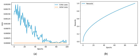 The learning performance is illustrated through two key graphs. The first graph (Figure 9a) shows the loss curves for both the critic and actor components. The critic loss consistently decreases over 100 epochs, indicating enhanced accuracy in evaluating state-action pairs, while the actor loss remains low and stable, reflecting effective policy learning. The second graph (Figure 9b) presents the reward progression, which indicates the model’s success in maximizing network efficiency. The rewards steadily increase, demonstrating the model’s improving performance in optimizing resource allocation. This upward trend signifies the model’s growing ability to enhance V2X communication reliability and minimize resource wastage and collision.