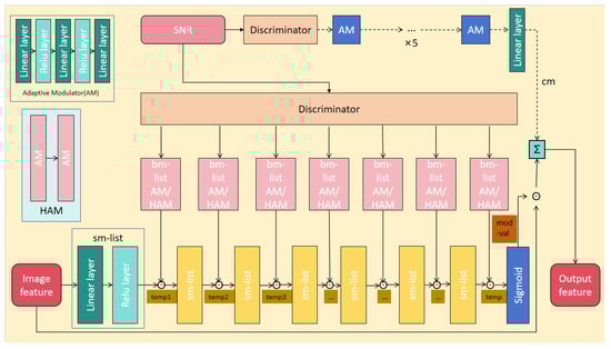 The channel adaptive module (CAM) undertakes a sophisticated modulation process as outlined below: Upon receiving image features extracted by an advanced feature extractor, the CAM begins by assessing the current channel conditions in real-time. Based on these assessments, the bm-list module primarily applies Amplitude Modulation (AM) principles to derive a multiplicative modulation factor (bm). This bm factor is dynamically computed and then multiplied with the modulated image features generated by the preceding sm-list module, resulting in the creation of refined hidden features termed temp1. As these hidden features traverse subsequent sm-list and bm-list modules within the CAM, they undergo further enhancement and modulation.