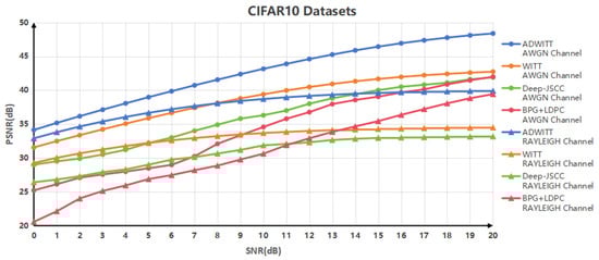 PSNR performance of CIFAR10 datasets in AWGN channel and RAYLEIGH fast fading channel.