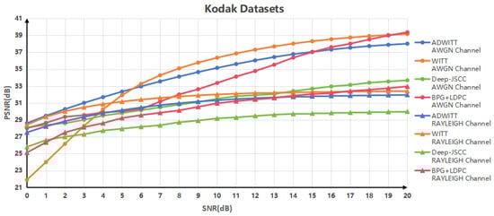 Figure 4 depicts the relationship between the Peak Signal-to-Noise Ratio (PSNR) values achieved through various encoding modes in high-resolution image scenarios and the signal-to-noise ratio (SNR) across different channel conditions. The findings indicate that the performance of the ADWITT structure introduced in this study surpasses that of the conventional WITT model, deep Joint Source–Channel Coding (JSCC) framework, and separated source–channel coding, particularly under the condition of AWGN channels with low-SNR conditions. In high-SNR scenarios, the ADWITT architecture consistently maintains the performance of the optimal model and demonstrates a significant advantage over the deep JSCC architecture. Furthermore, in the RAYLEIGH fast fading channel environment, the ADWITT structure consistently upholds the performance of separated source–channel coding under low-SNR conditions, outperforming both the traditional WITT model and the deep JSCC framework. In high-SNR conditions, the ADWITT structure consistently matches the performance of the WITT model and separated source–channel coding, while also exhibiting a marked improvement over the deep JSCC architecture. The experimental results affirm that the ADWITT architecture proposed in this study is capable of achieving high-quality image reconstruction across all SNR conditions when processing high-resolution images, thereby rendering the ADWITT model more adaptable and robust in accommodating various channel conditions.
