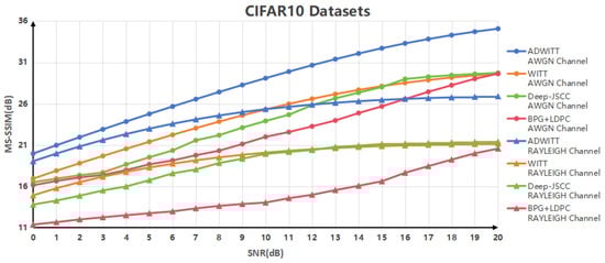 Figure 3 illustrates the correlation between Peak Signal-to-Noise Ratio (PSNR) values achieved through various coding modes and signal-to-noise ratios (SNRs) across different channel conditions within datasets characterized by low resolution. The findings indicate that the ADWITT architecture proposed in this study outperforms the conventional WITT model, deep Joint Source–Channel Coding (JSCC) architecture, and discrete source–channel coding in AWGN channels, exhibiting higher PSNR values across all SNR levels. Furthermore, in the context of RAYLEIGH fast fading channels, the ADWITT structure demonstrates considerable performance advantages over the aforementioned three methods, particularly under low SNR conditions. At elevated SNR levels, the ADWITT architecture exhibits performance that is comparable to traditional split source–channel coding, while significantly surpassing the performance of the other two coding techniques. It is important to note that the performance of all architectures is diminished in RAYLEIGH fast fading channels when compared to AWGN channels. This degradation is attributed to the severe distortion and errors in the received signal caused by rapid fading and multipath effects inherent in the channel. Conversely, in AWGN channels, the distortion and errors are relatively minimal, which contributes to the overall performance reduction of each model in RAYLEIGH fast fading channels. These results underscore the capability of the ADWITT architecture within datasets characterized by low resolution to sustain high image quality across varying SNR conditions and to preserve the similarity between the transmitted image and the original image, regardless of whether the channels are AWGN or RAYLEIGH fast fading.
